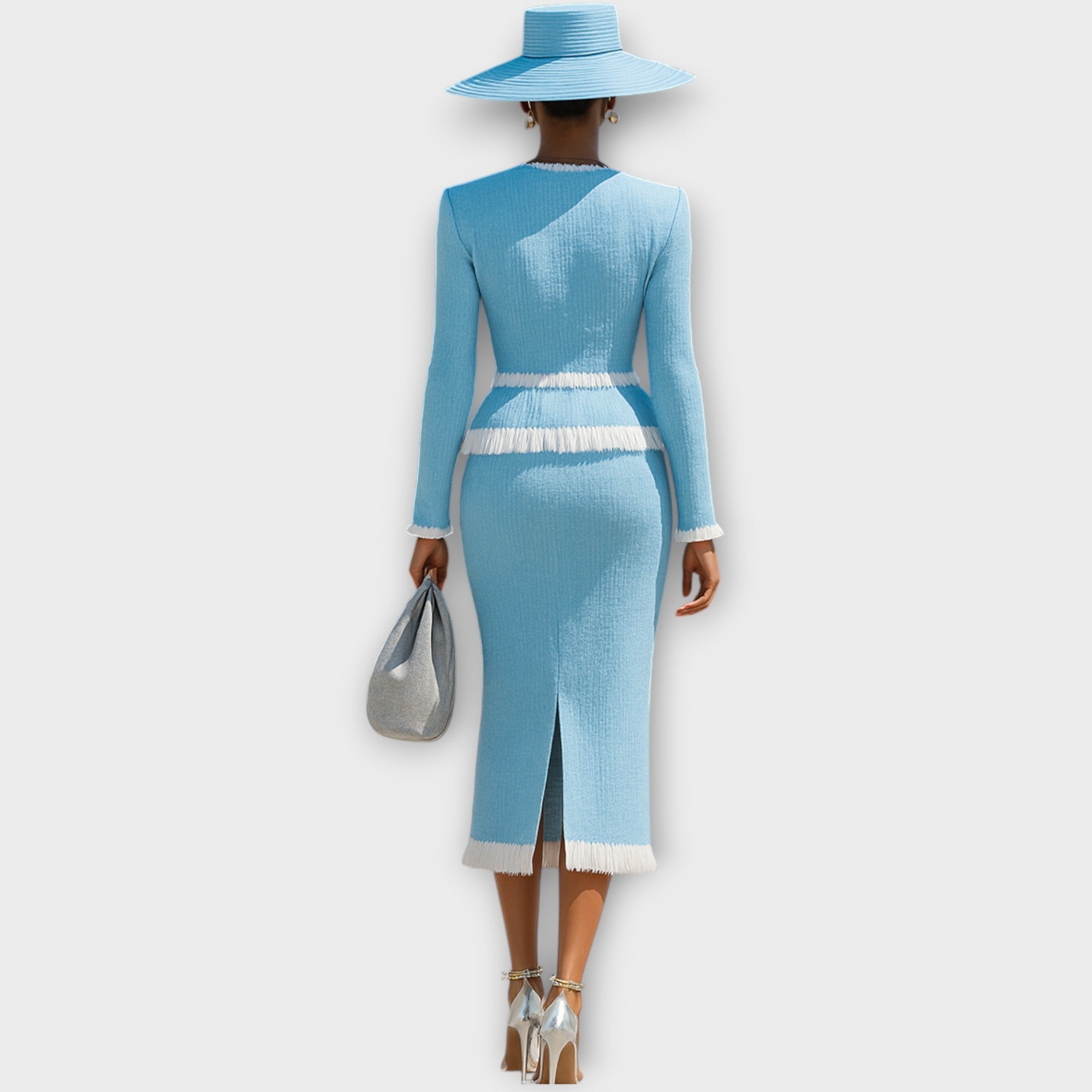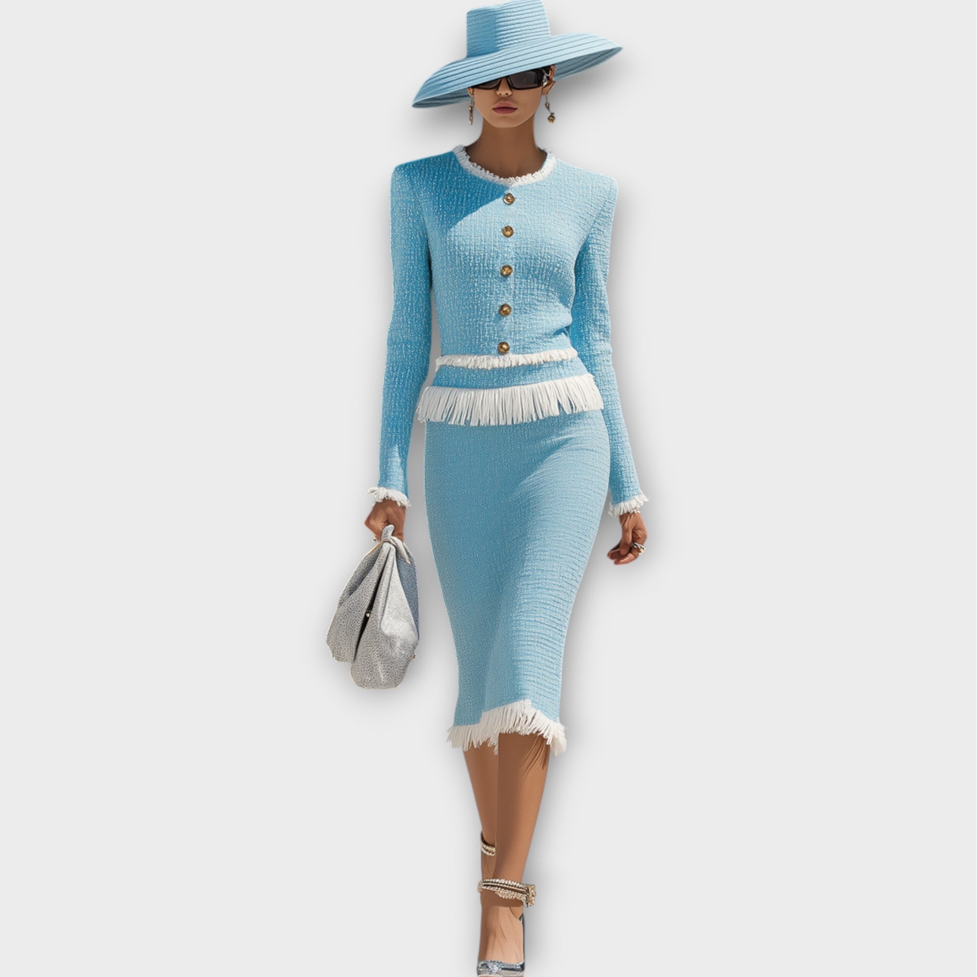 Rafiniran komplet krila z dvema deloma združuje luksuz in sofisticiranost s svojo krojeno silhueto in šik resicami. Zasnovan za ustvarjanje vtisa, ponuja brezčasno eleganco, ki je popolna za prestižne dogodke, poslovne priložnosti ali visokoklasne izhode.