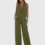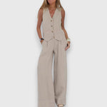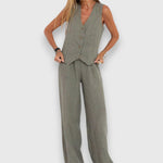 Brezrokavnik v prilegajočem slogu se sreča z udobnimi hlačami, kar ponuja moderno in laskavo silhueto.