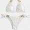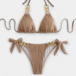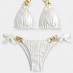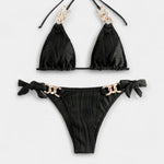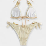 Uživajte v stilu in udobju s tem modernim dvodelnim bikini kompletom, ki navdušuje s svojo teksturirano črtasto tkanino in zlatimi detajli.
