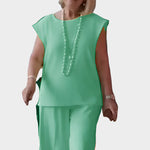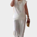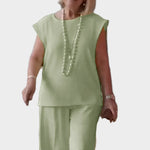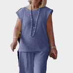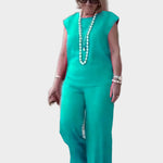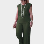 Udoben kroj: Hlače širokih nog in brezrokavnik nudijo popolno svobodo gibanja.