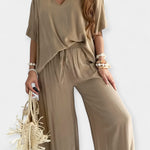 Ta set je epitom sproščene elegance. Široke hlače s udobnimi manšetami harmonično kombinirajo z ohlapnim vrhom z V-izrezom in širokimi rokavi – za slog, ki diha in poudarja vsako silhueto.