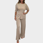 Udoben in moderen komplet, ki sestoji iz bluze s pasom in širokih hlač, je idealno za vsakodnevno nošenje in sproščene izhode. Ta komplet ponuja svobodo gibanja in sodoben slog.